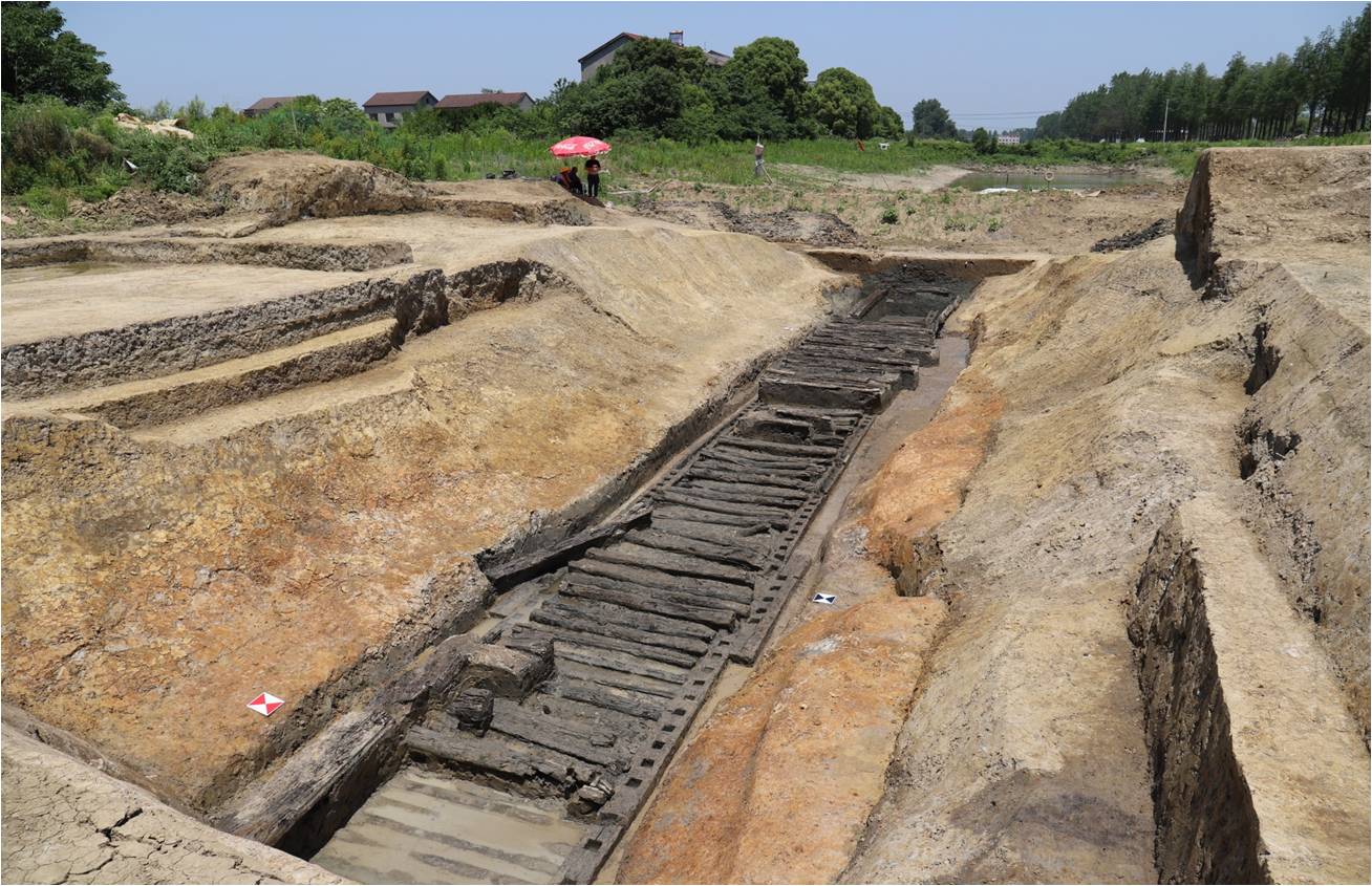 本发掘点位于郢城南城垣中段,郢城“南、北水系”与“南内壕”交汇处,发现木构遗存一座(编号MG1)。该木构遗存为南北向,总长45.32米,从结构上可分为南北两段:南段长33.05、宽2.53、内空2.04米,分别由底板、墙板、盖板组成,底板由圆木和方木并排平铺而成,其上东西各立一排墙板。墙板内侧立有方形木桩,与底板榫卯相连,用于抵挡墙板内收。墙板上横向平铺圆木,中间各有一排排列有序的榫眼,榫眼呈方形,用于立柱支撑盖板。盖板仅北部有一部分残存,东西向并排平铺。南端出水口呈“八”字形,两边各一根圆木,上残存排列有序的榫眼。北段分别由底板、立柱、挡板、盖板组成,底板由方木和的圆木并排平铺而成,两端弓篷榫,立柱立于两端与其榫卯相连,挡板位于立柱外侧,仅存少量盖板。北段底板高于南段底板0.06米。