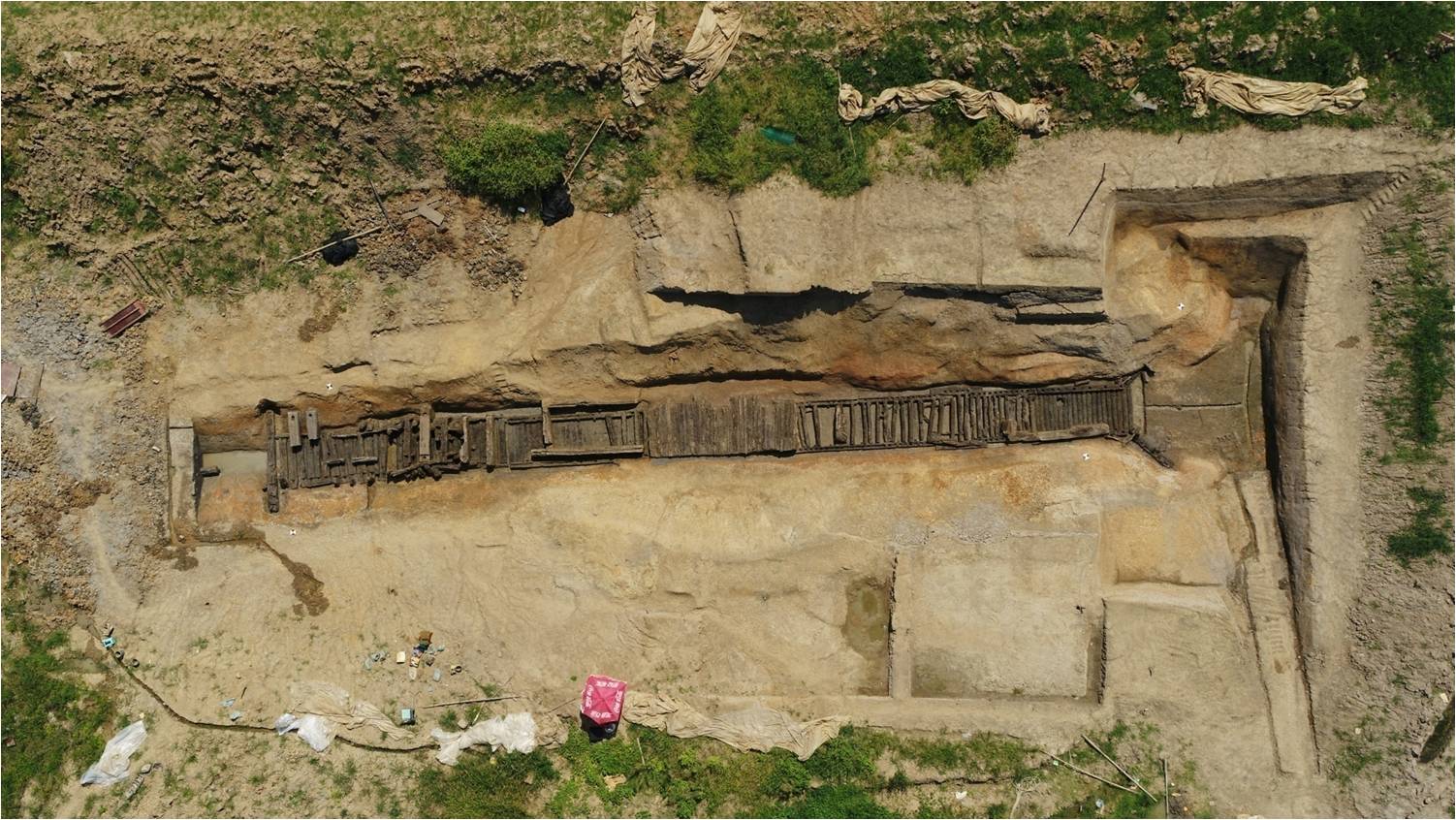 本发掘点位于郢城南城垣中段,郢城“南、北水系”与“南内壕”交汇处,发现木构遗存一座(编号MG1)。该木构遗存为南北向,总长45.32米,从结构上可分为南北两段:南段长33.05、宽2.53、内空2.04米,分别由底板、墙板、盖板组成,底板由圆木和方木并排平铺而成,其上东西各立一排墙板。墙板内侧立有方形木桩,与底板榫卯相连,用于抵挡墙板内收。墙板上横向平铺圆木,中间各有一排排列有序的榫眼,榫眼呈方形,用于立柱支撑盖板。盖板仅北部有一部分残存,东西向并排平铺。南端出水口呈“八”字形,两边各一根圆木,上残存排列有序的榫眼。北段分别由底板、立柱、挡板、盖板组成,底板由方木和的圆木并排平铺而成,两端弓篷榫,立柱立于两端与其榫卯相连,挡板位于立柱外侧,仅存少量盖板。北段底板高于南段底板0.06米。