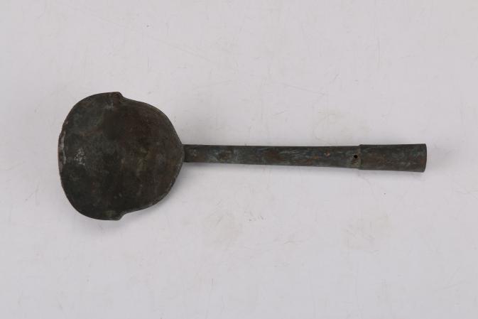另外江陵马山1号楚墓还出土了一件呈锅铲形的长匕(图五),匕面呈铲状,前面宽平,后部呈弧形且略深,柄中空以安木柄。这类匕过去常称作勺,根据老河口安岗1号墓、荆门包山2号墓、江陵望山2号墓的遣策简可知其称为匕。马山1号楚墓的这件铲形匕宽7.1、深1.7、金属柄长13.5、木柄长39.5厘米,比同墓出土的错银镂空铜匕宽且长,且其腹又较浅,不适合挹取液体,可能是用于盛取饭食或肉羹。