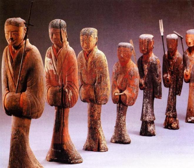 图三 荆州凤凰山167号汉墓出土木俑(从前往后依次是谒者俑、袖手侍俑、持物侍俑、持农具俑)