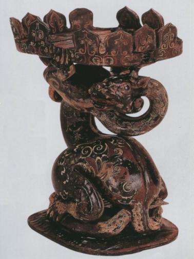荆州博物馆藏有件漆木豆,凤鸟莲花盖豆(图一)是其中最精美的一件2000年出土于荆州天星观2号楚墓。通体髹黑漆为地,用红、黄二色彩绘。由浮雕龙纹盖、莲花豆盘、凤鸟、蛇分件制成。莲花豆盘外壁上部一周浮雕十四瓣仰莲花,盘下以一凤鸟为柄。凤鸟头后仰向上,鸟颈弯曲,鸟尾呈扇形。后仰的鸟头、凤冠与鸟背相接,鸟嘴张开衔住豆盘下的方榫头,以起支撑作用。凤鸟站立于蛇身之上,双爪齐抓一条蜷伏的蛇,蛇身修长,蛇尾后飘上翘至鸟尾下部中间呈支撑状,表明楚人在制器过程中已能较好地运用物理学受力平衡的原理。盘径24.8、高26厘米。