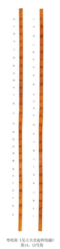 2020年10月,在距出土“吴王光戟”的唐维寺M113仅几百米处的另一座编号为“枣林铺造纸厂M46”的战国楚墓中,也出土了一批竹简,我们省称其为“枣纸简”。目前,这批竹简尚在保护修复中。其中有一篇由整理研究者题为《吴王夫差起师伐越》,共用竹简79支,详细记载了吴王夫差与越王勾践的争霸之战。这篇竹书与2017年公布的清华大学藏战国竹简《越公其事》为同一内容,但行文上略有增删。学术界据此评价道:通过考古发掘出土的枣纸简,证明了非科学出土面世的清华简确为真简。在枣纸简《吴王夫差起师伐越》的第14、15、16号简中,记叙了吴王夫差所说的一段话:“