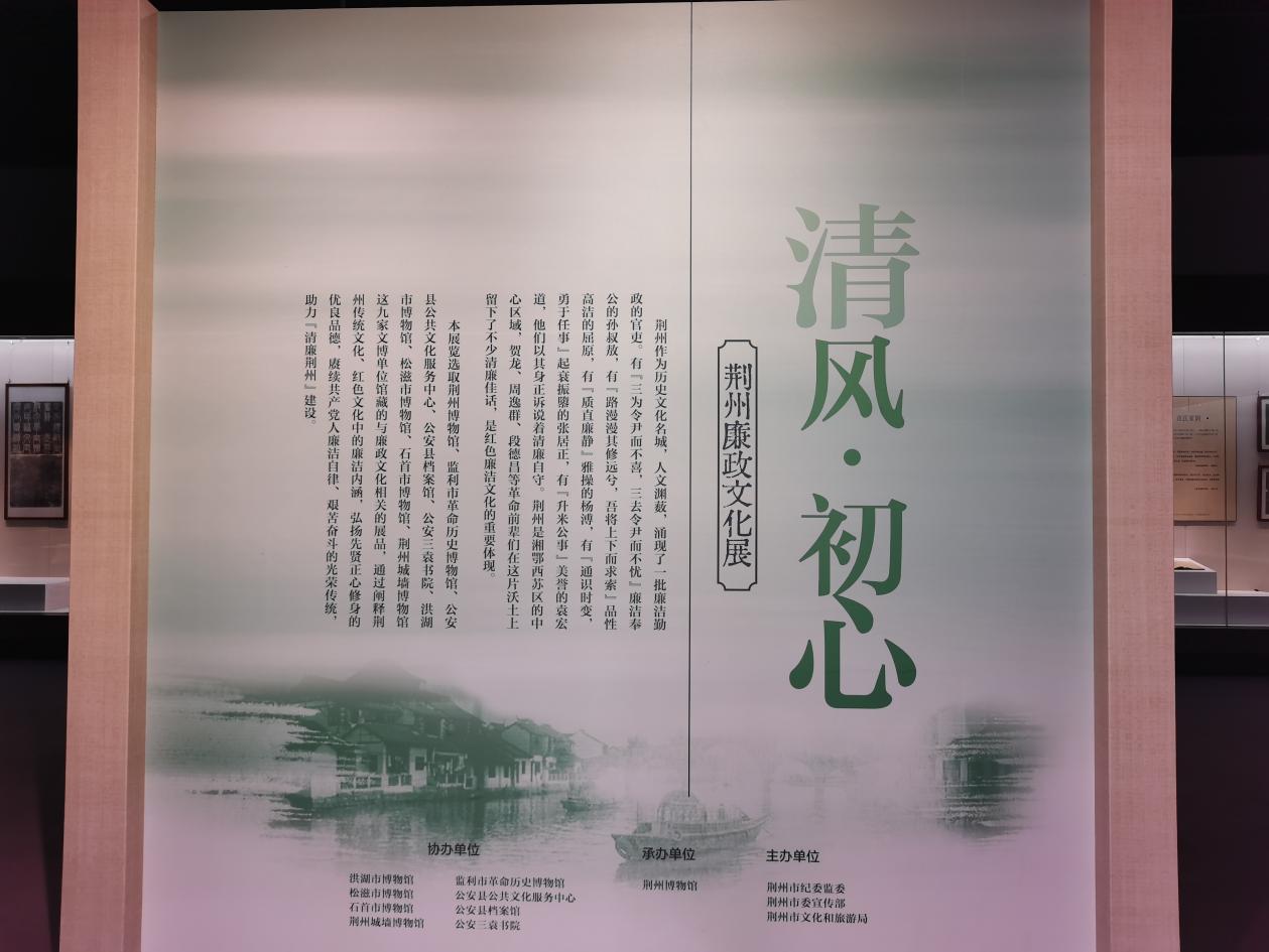 为配合荆州市2023年廉洁文化建设重点工作实施,集中展示荆楚文化中的清廉元素和荆州红色资源中的廉洁基因,由荆州市纪委监委、荆州市委宣传部、荆州市文化和旅游局主办,荆州博物馆承办的“清风·初心——荆州廉政文化展”于2023年8月8日在荆州博物馆临时展厅开展,展期至9月8日。