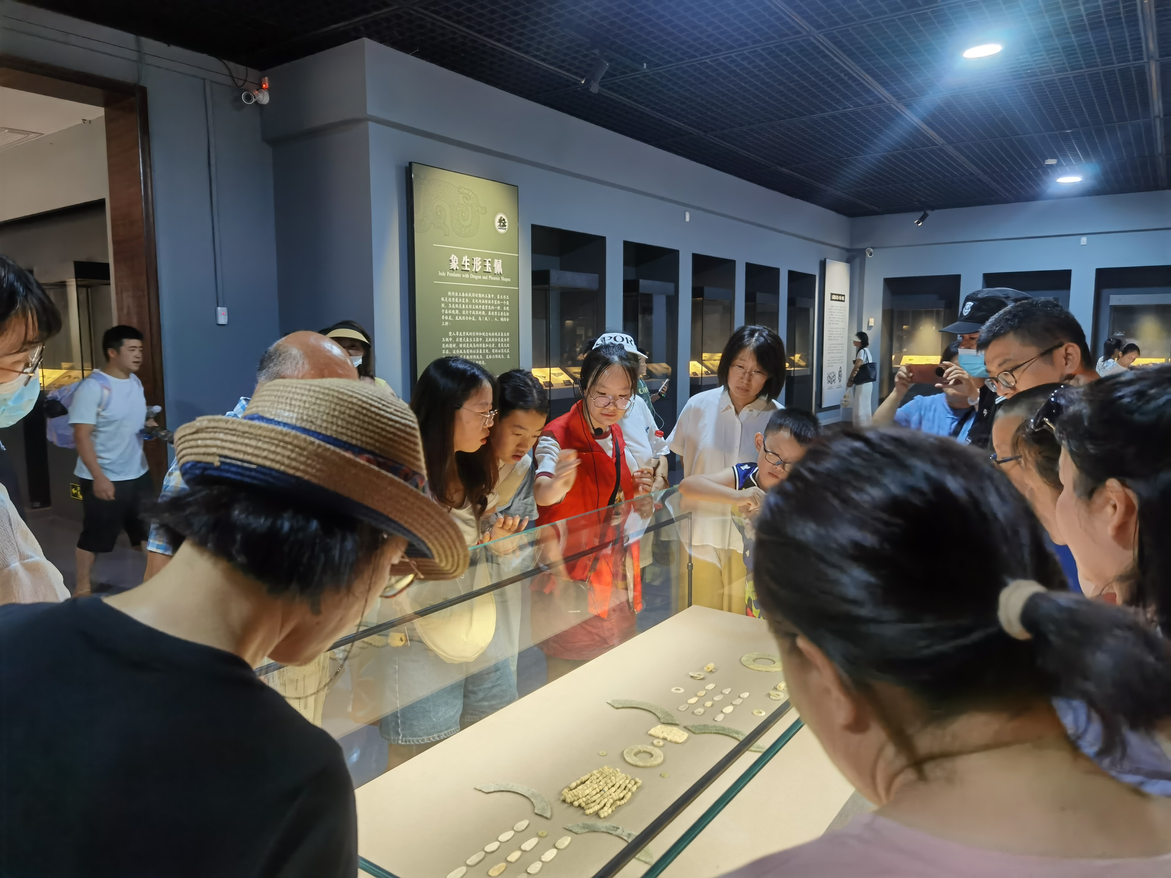 大学生志愿者位游客讲解江汉平原原始文化和玉器展厅
