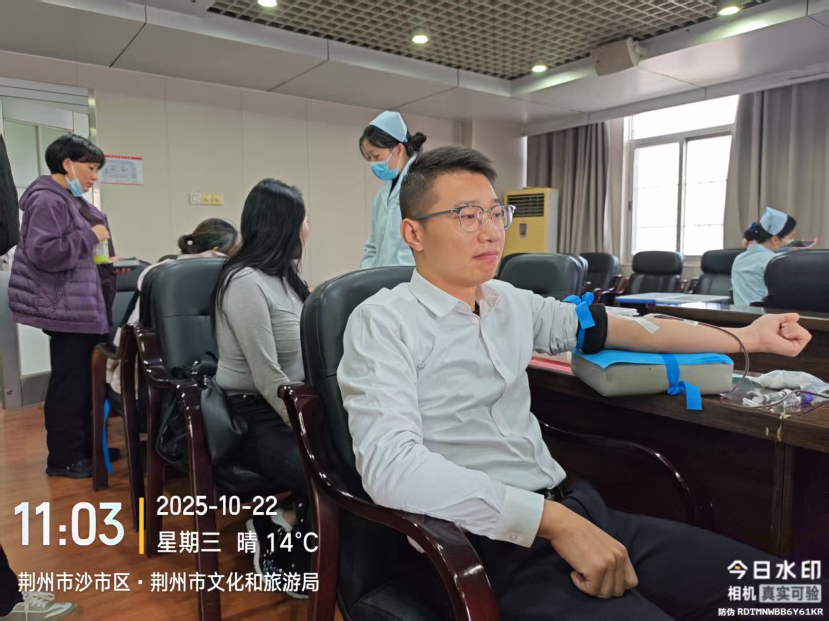 2025年10月22日上午,荆州博物馆20余名干部职工参加了荆州市文化和旅游局组织的献血活动,以实际行动履行社会责任,展现了文博工作者的奉献精神。