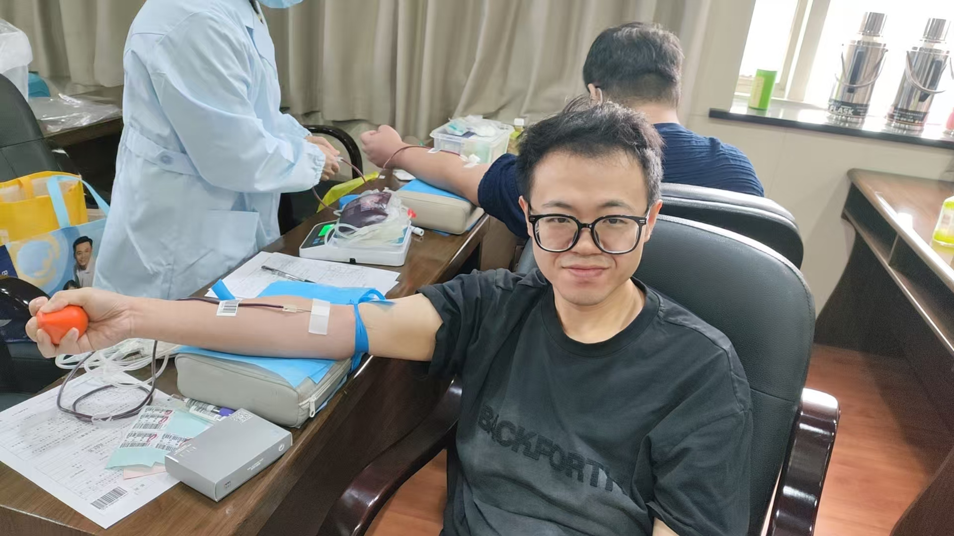 现场氛围热烈,温情与勇气交织。献血者当中,有多年坚持献血的“公益模范”;也有初次尝试的“热血青年”。一袋袋温热的血液,汇聚成守护生命的暖流,凝聚着我馆职工无私奉献的赤诚之心。